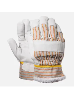 Рабочие перчатки изготовлены из козьей кожи. Тыльная сторона ладони выполнена из хлопчатобумажной ткани. Внутренняя часть перчатки имеет меховую подкладку. Тыльная сторона перчатки имеет эластичный элемент, фиксирующий запястье. Эти перчатки легко надевать и снимать.